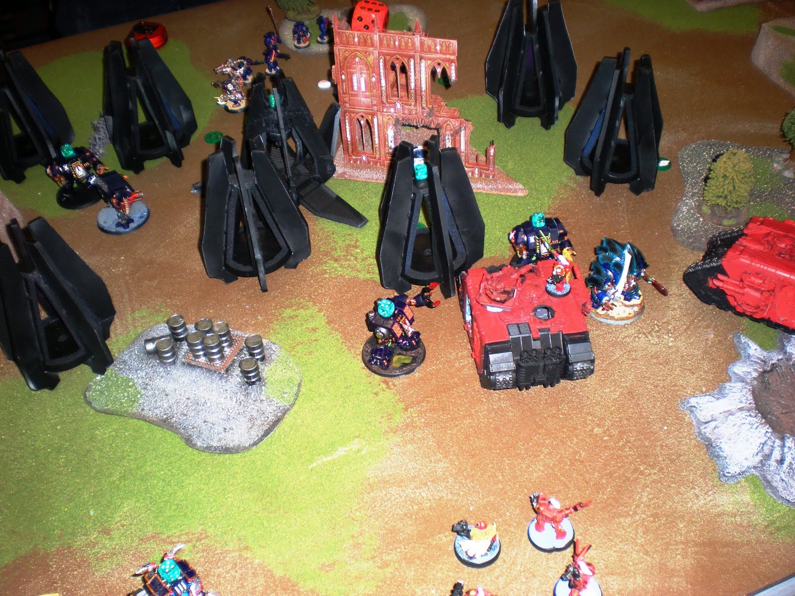 His Librarian dread shoots my other Land Raider and takes off a Lascannon. His Drop Pods shoot my strike squad down to the Justicar. He assaults my purifiers squad and takes them out.